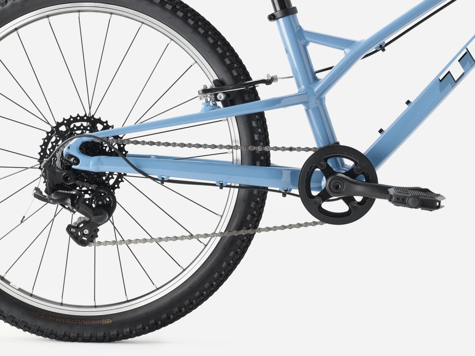 Einen Rahmen aus Alpha Silver Aluminium mit 24 Zoll großen Laufrädern und 2 Zoll breiten Reifen, die für Grip und Geschwindigkeit auf Asphalt konzipiert sind. Dazu gibt es eine speziell auf Kinderbedürfnisse zugeschnittene Ausstattung, wie etwa die intuitive 8-Gang-Schaltung von microSHIFT und unkomplizierte Felgenbremsen samt kindgerechten Bremshebeln.