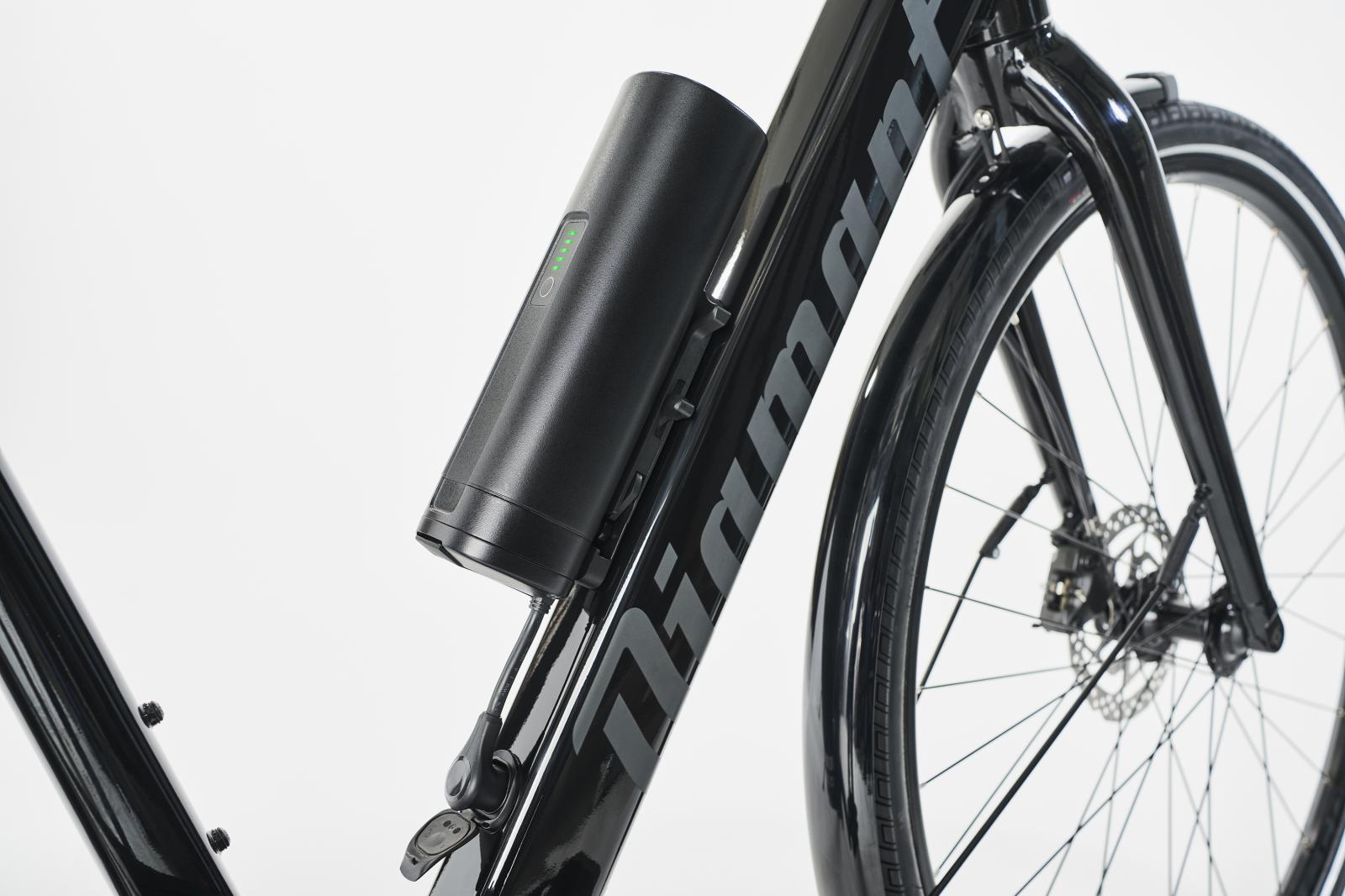 - Der 250Wh-Akku im Unterrohr ermöglicht bis zu 60km Reichweite. Der Akku kann zu Wartungszwecken entnommen werden. Einen Zusatzakku in Form eines kleinen Zylinders kannst du optional ergänzen.