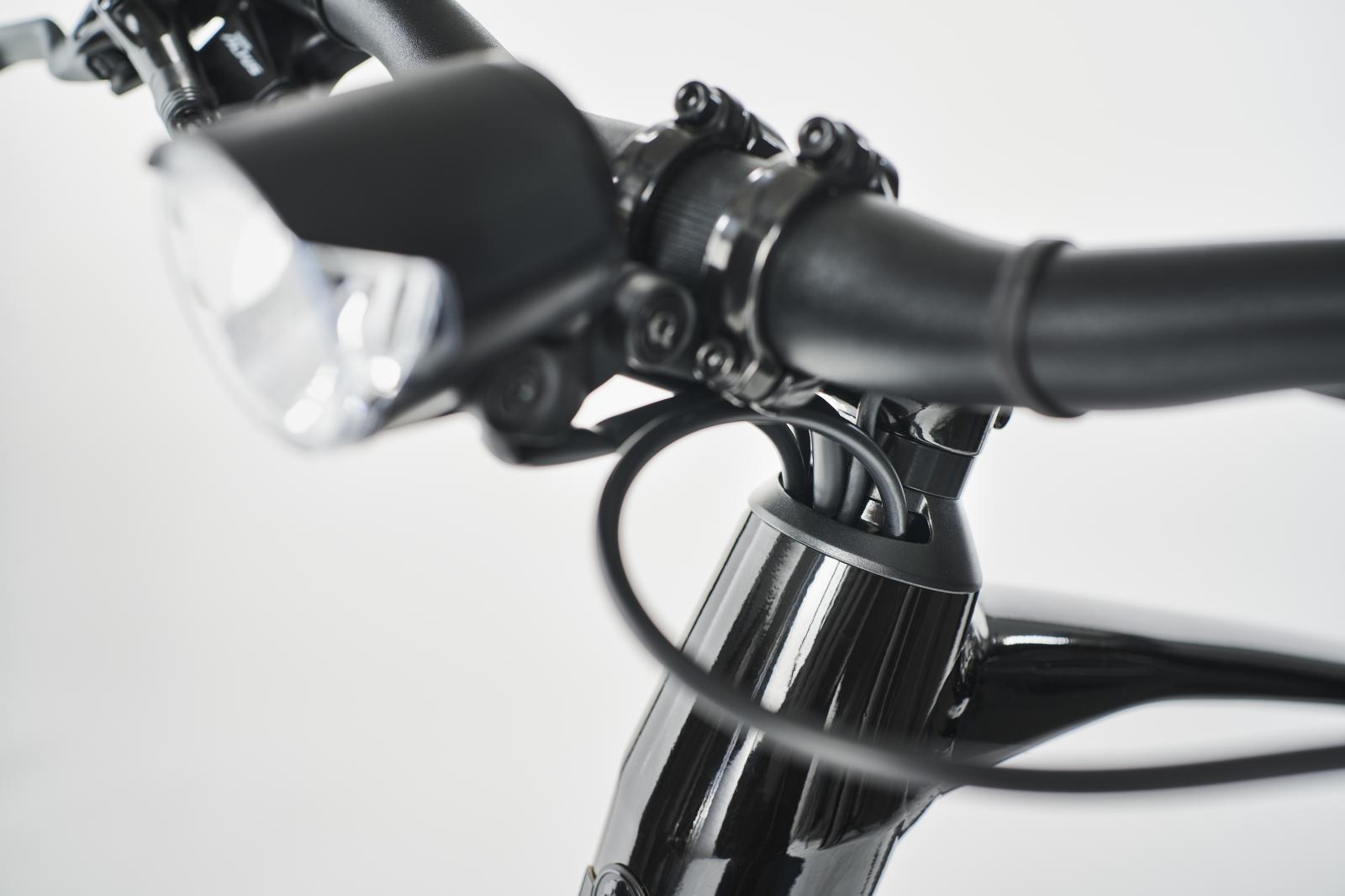 - Der sehr leichte Aluminiumrahmen versteckt, dass er mit Strom angetrieben wird. Für eine klare Optik und weniger Dreck laufen auch alle Kabel schon am Vorbau integriert.