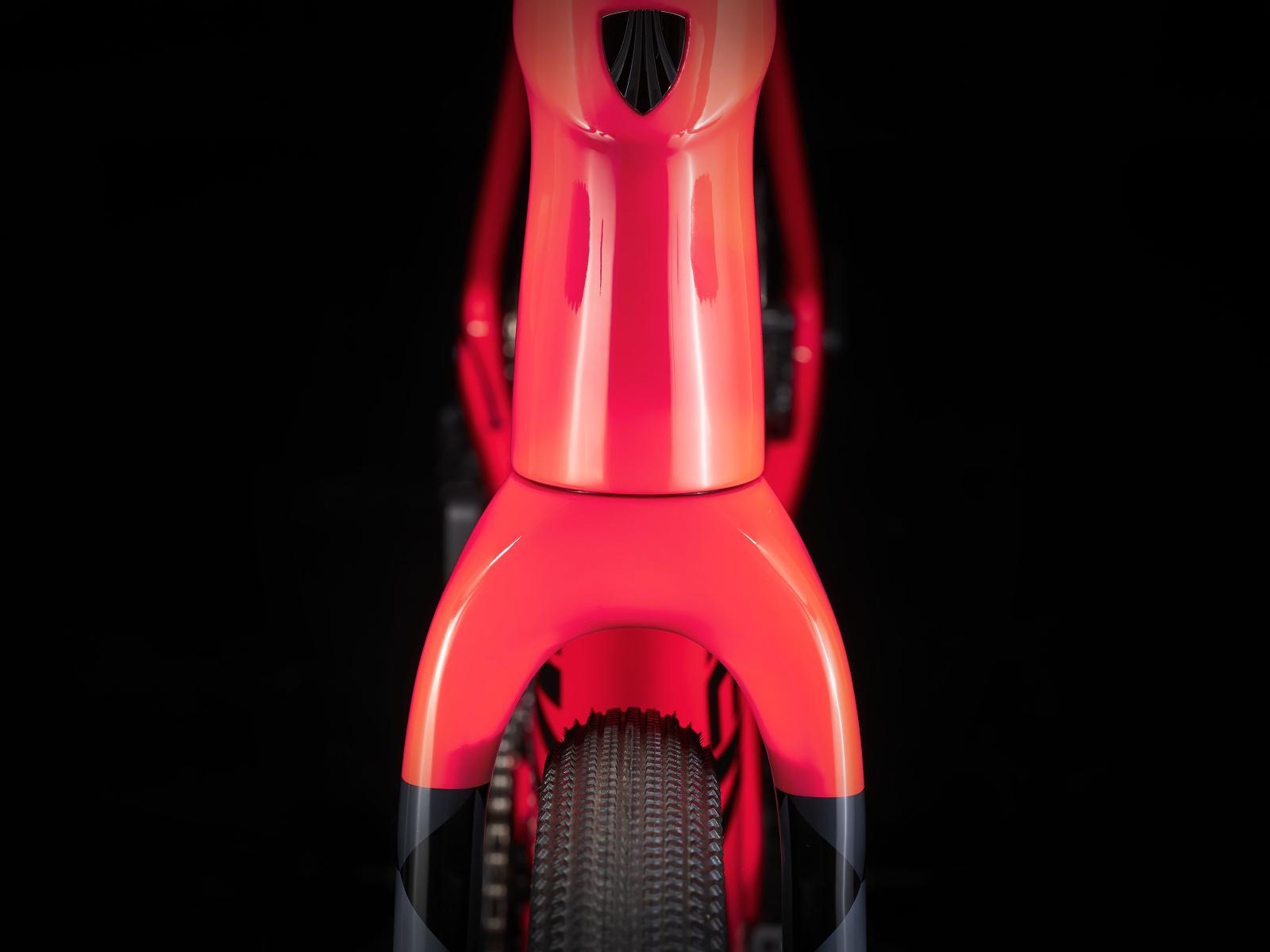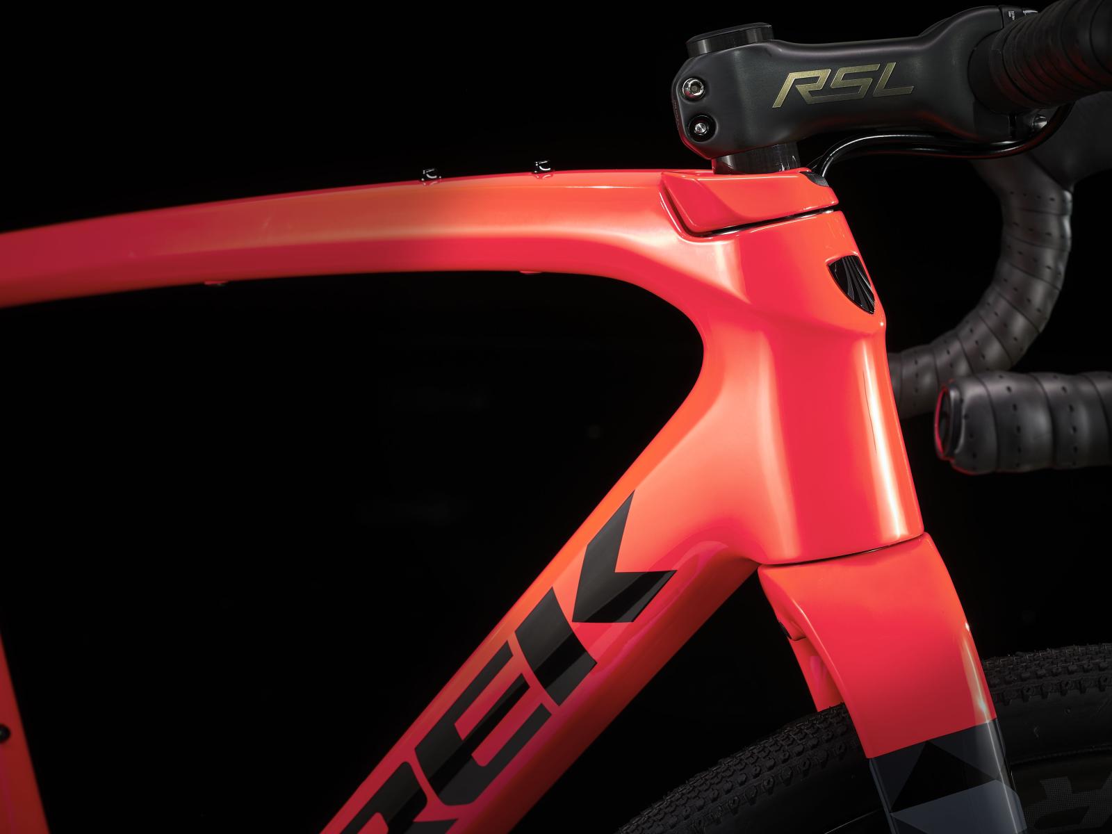 Einen Rahmen aus 700 Series OCLV Carbon mit IsoSpeed und Carbon Armor und mit einer progressiven Geometrie, die bei hohen Geschwindigkeiten stabil und auf knackigen Anstiegen effizient ist. Dazu gibts ein internes Staufach, verborgene Züge, die deinen Taschen nicht in die Quere kommen, und integrierte Befestigungselemente für eine Rahmentasche und für Schutzbleche. Außerdem bekommst du eine Carbongabel, SRAMs drahtlosen, elektronischen RED AXS 1x12-Antrieb mit breitem Übersetzungsbereich, Bontragers Aeolus RSL 37V-Carbonlaufräder und breite Gravelreifen im Format 700 x 40C für noch mehr Stabilität und Traktion. Der Rahmen bietet