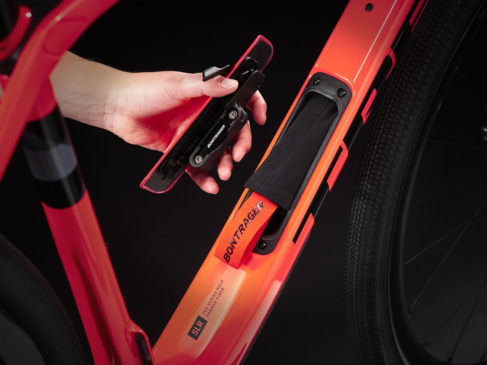 - Ein schlankes, im Rahmen integriertes Staufach ermöglicht die Unterbringung von Werkzeug und Ausrüstung.