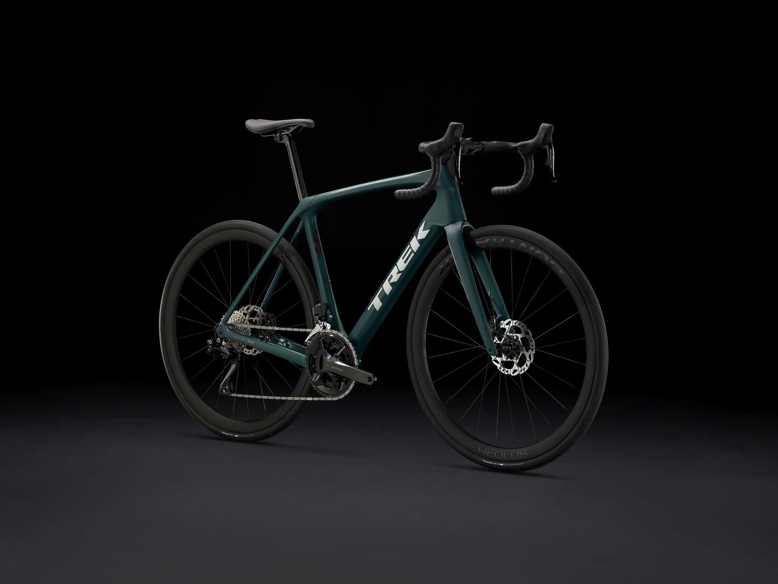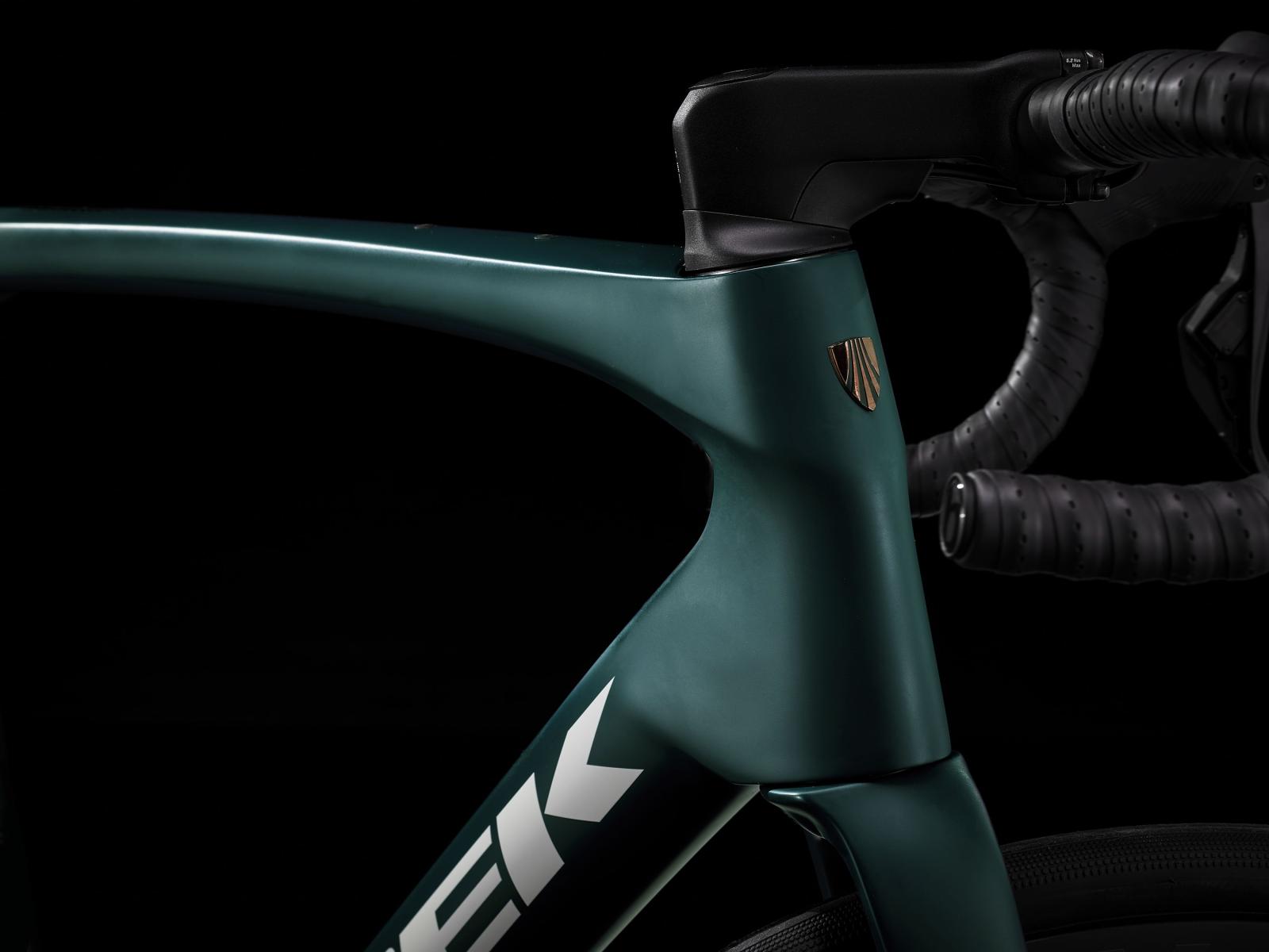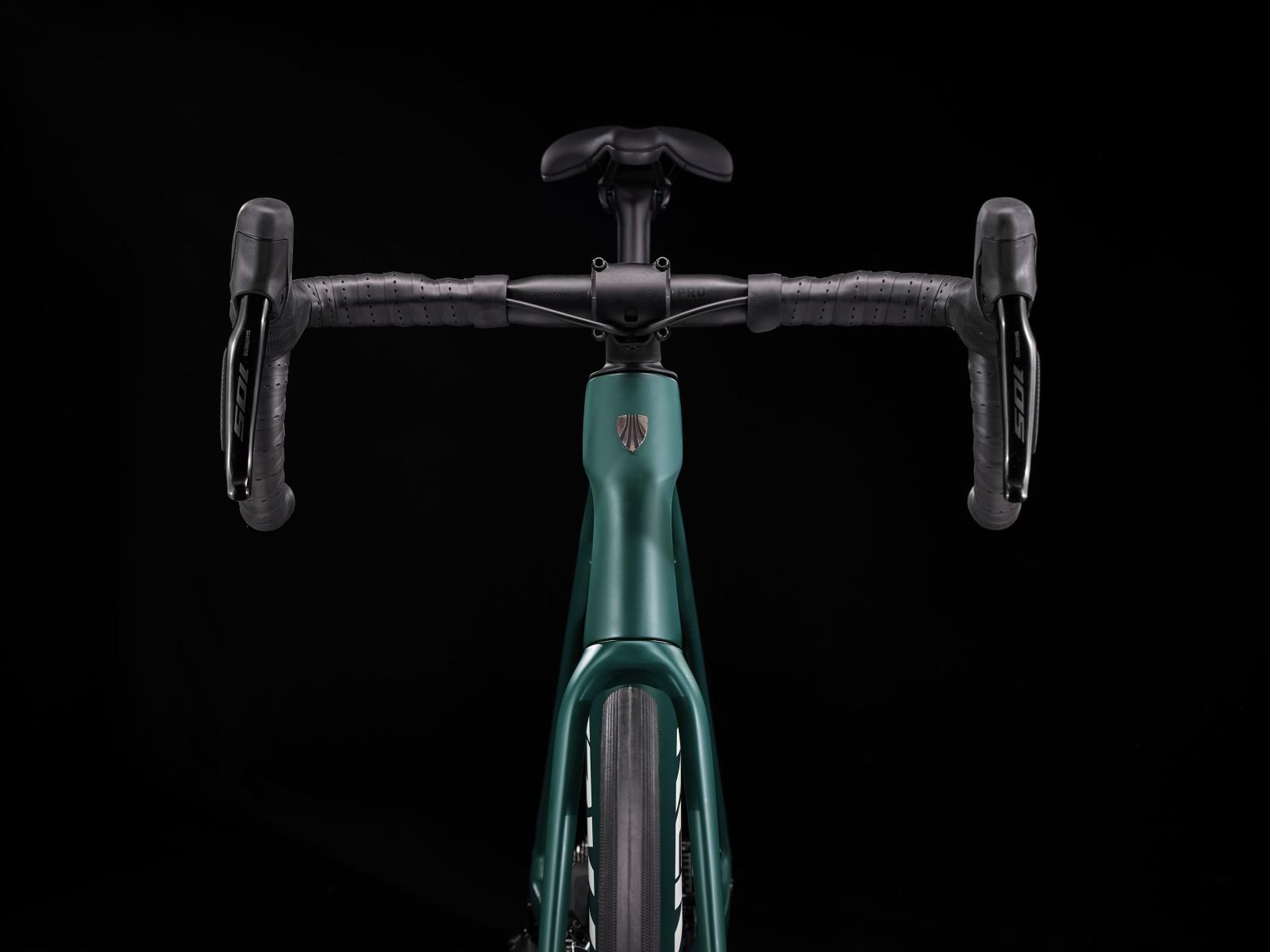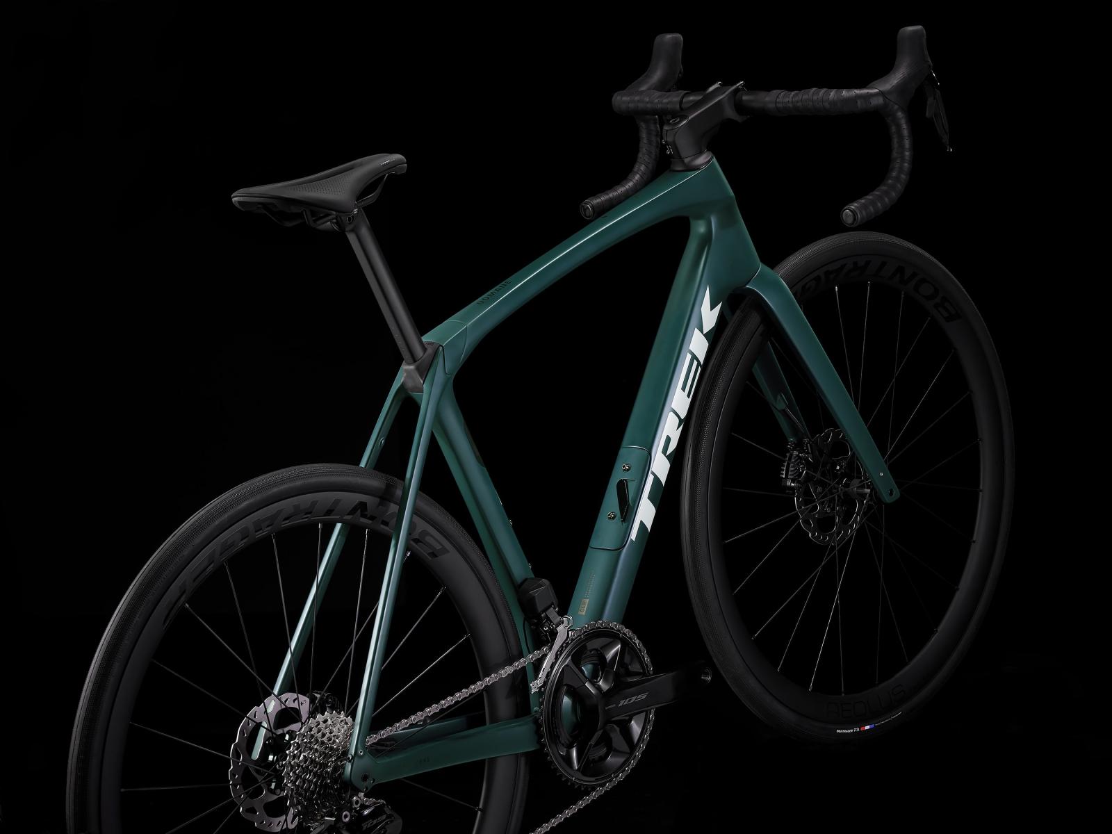 Einen Rahmen samt Gabel aus 800 Series OCLV Carbon mit hinterem IsoSpeed, internem Staufach und Befestigungsmöglichkeiten am Oberrohr. Ausgestattet ist es mit Shimanos drahtlosem, elektronischem 105 Di2 2x12-Antrieb, kraftvoll zupackenden Flat Mount-Scheibenbremsen, Aeolus Pro 37-Carbonlaufrädern und einem Bontrager Pro IsoCore-Lenker, der Straßenvibrationen im Vergleich zu herkömmlichen Carbonlenkern um 20 % verringert.