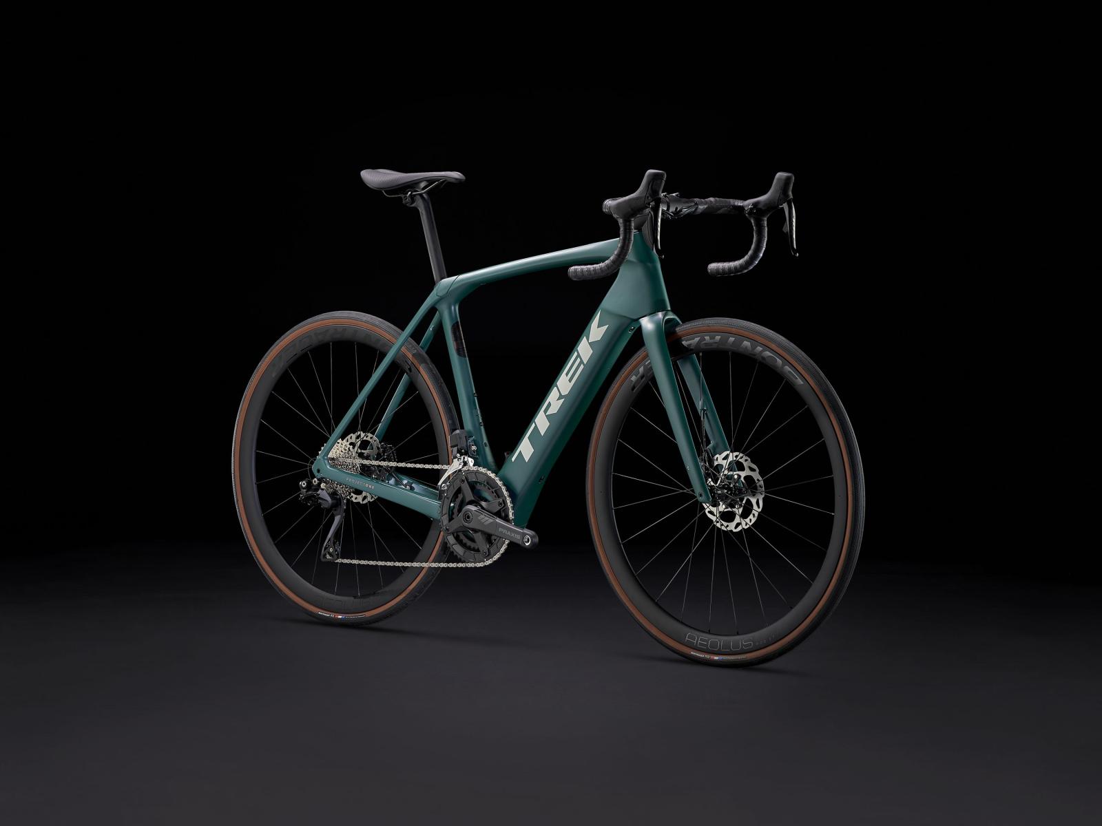 Einen äußerst leichten Rahmen aus 800 Series OCLV Carbon mit hinterem IsoSpeed. Einen kraftvollen Harmonic Pinring-Motor von TQ mit einem Drehmoment von 50 Nm, der dich bis zu einer Geschwindigkeit von 25 km/h unterstützt, einen 360 Wh großen integrierten Akku, ein in den Rahmen integriertes, smartes LED-Display und diskret in die Bremsgriffgummis verbaute Bedienelemente für das Umschalten der Unterstützungsmodi. Aeolus Pro 37-Laufräder aus OCLV Carbon, eine drahtlose, elektronische Shimano 105 Di2 2x12-Schaltung, eine Carbonkurbelgarnitur, ein vibrationsdämpfender Bontrager Pro IsoCore-Lenker und ein RCS Pro-Vorbau mit vollstän