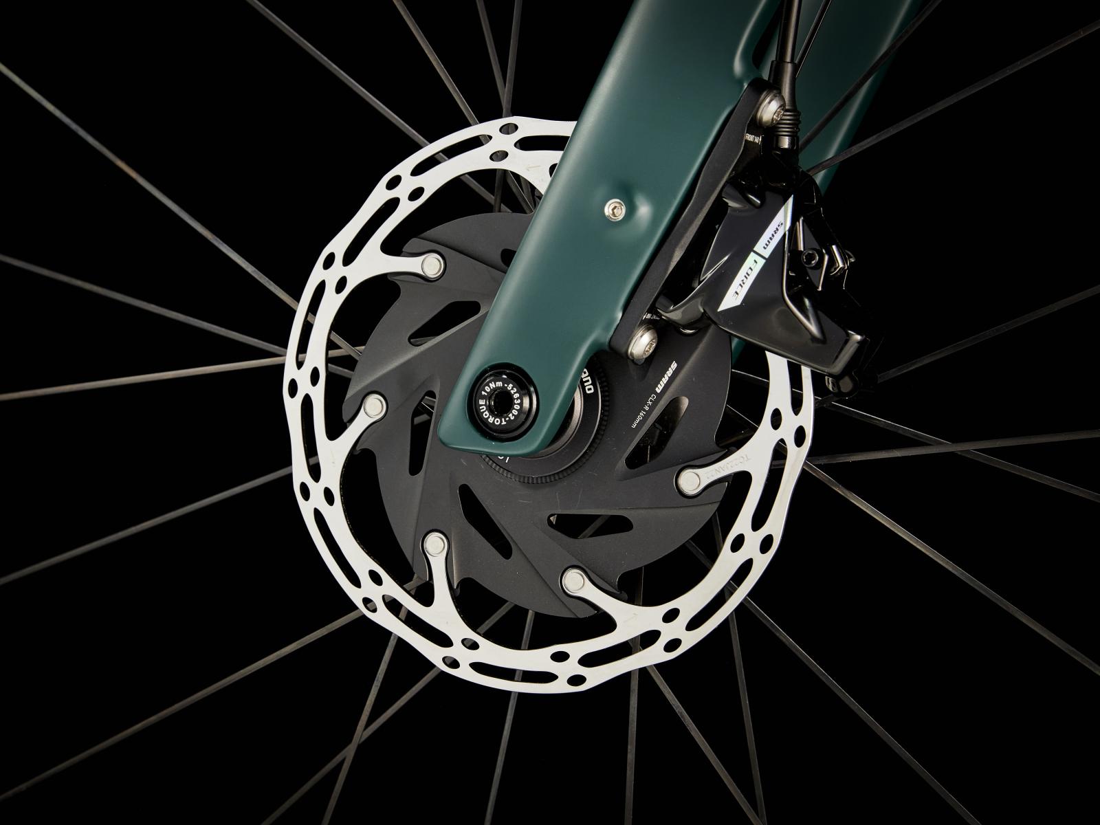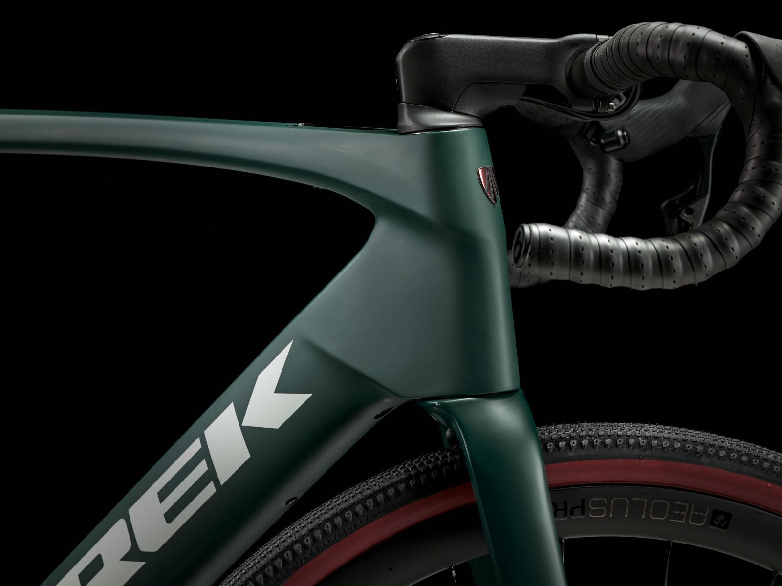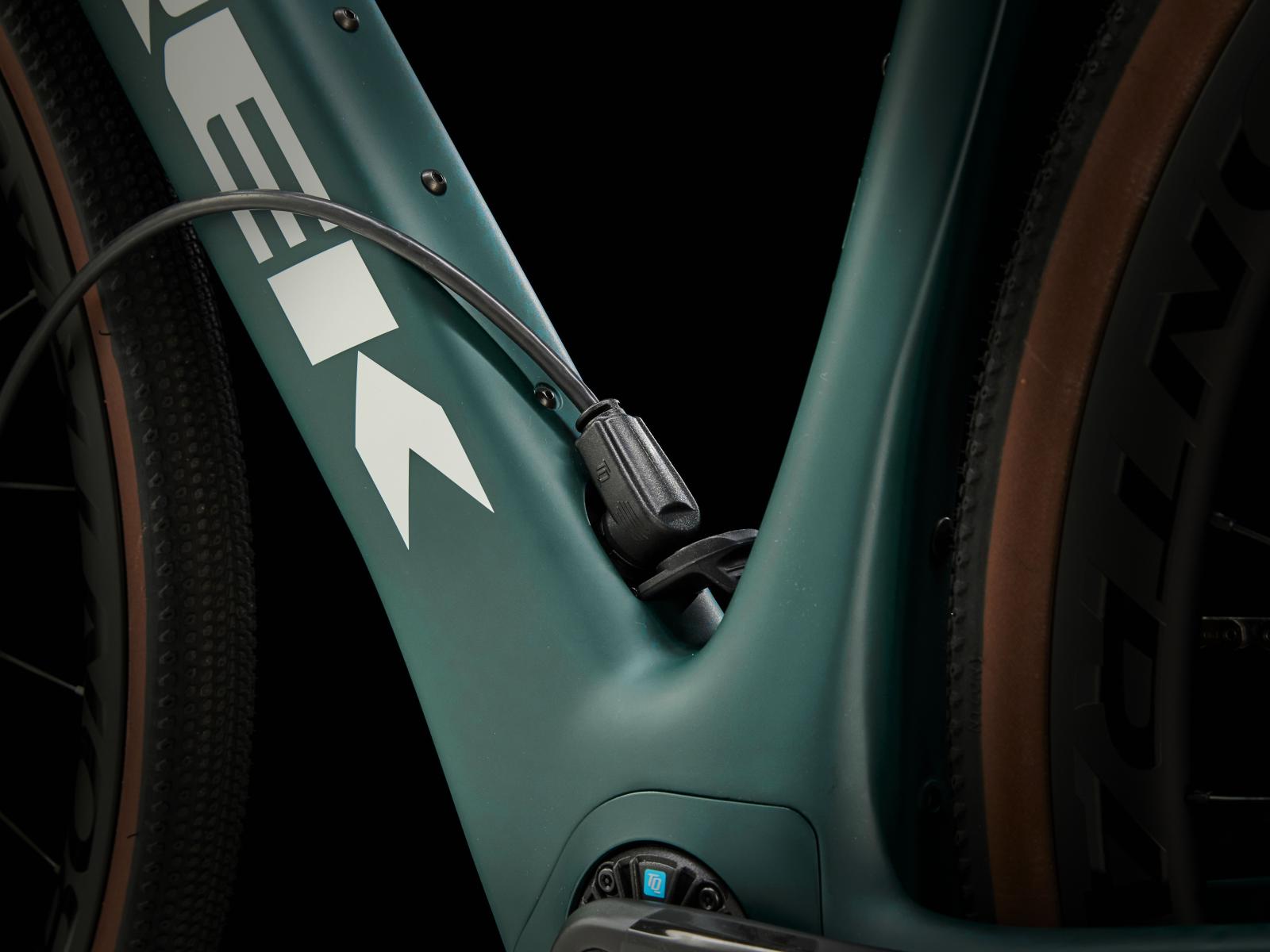 Unseren besten und leichtesten Rahmen aus 800 Series OCLV Carbon mit hinterem IsoSpeed. Einen kraftvollen Harmonic Pin Ring Motor von TQ mit 50 Nm Drehmoment und einer Unterstützung bis 25 km/h, einen 360 Wh großen integrierten Akku, ein in den Rahmen integriertes, smartes LED-Display und diskrete Bedienelemente in den Bremsgriffgummis für das Wechseln der Unterstützungsmodi. Aeolus Pro 3V Laufräder aus OCLV Carbon, eine drahtlose, elektronische SRAM Force XPLR AXS D2 1x12-Schaltung, Carbonkurbeln, einen vibrationsdämpfenden Bontrager Pro IsoCore Lenker und einen RCS Pro Vorbau mit integrierter Zugführung für eine cleane Optik.