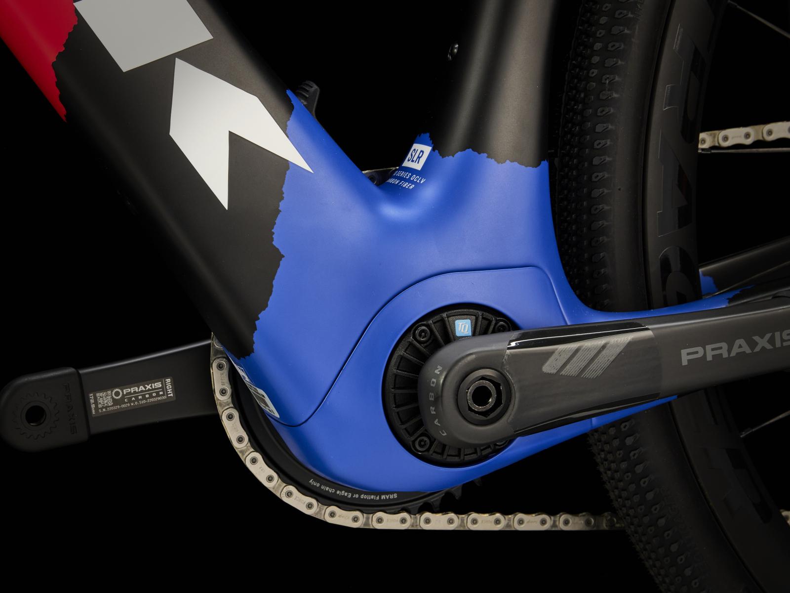 Unseren besten und leichtesten Rahmen aus 800 Series OCLV Carbon mit hinterem IsoSpeed. Einen kraftvollen Harmonic Pin Ring Motor von TQ mit 50 Nm Drehmoment und einer Unterstützung bis 25 km/h, einen 360 Wh großen integrierten Akku, ein in den Rahmen integriertes, smartes LED-Display und diskrete Bedienelemente in den Bremsgriffgummis für das Wechseln der Unterstützungsmodi. Aeolus Pro 3V Laufräder aus OCLV Carbon, eine drahtlose, elektronische SRAM Force XPLR AXS D2 1x12-Schaltung, Carbonkurbeln, einen vibrationsdämpfenden Bontrager Pro IsoCore Lenker und einen RCS Pro Vorbau mit integrierter Zugführung für eine cleane Optik.