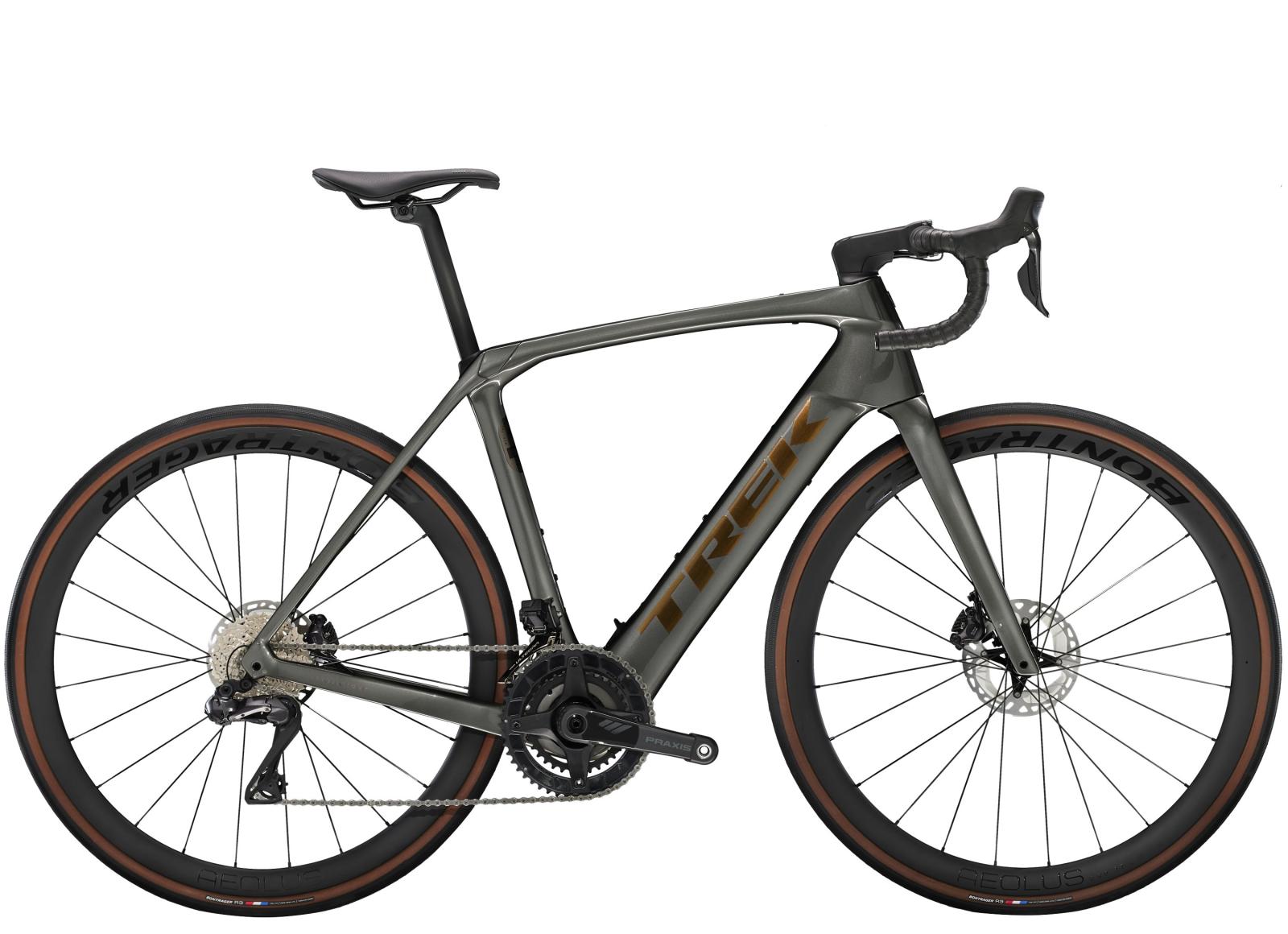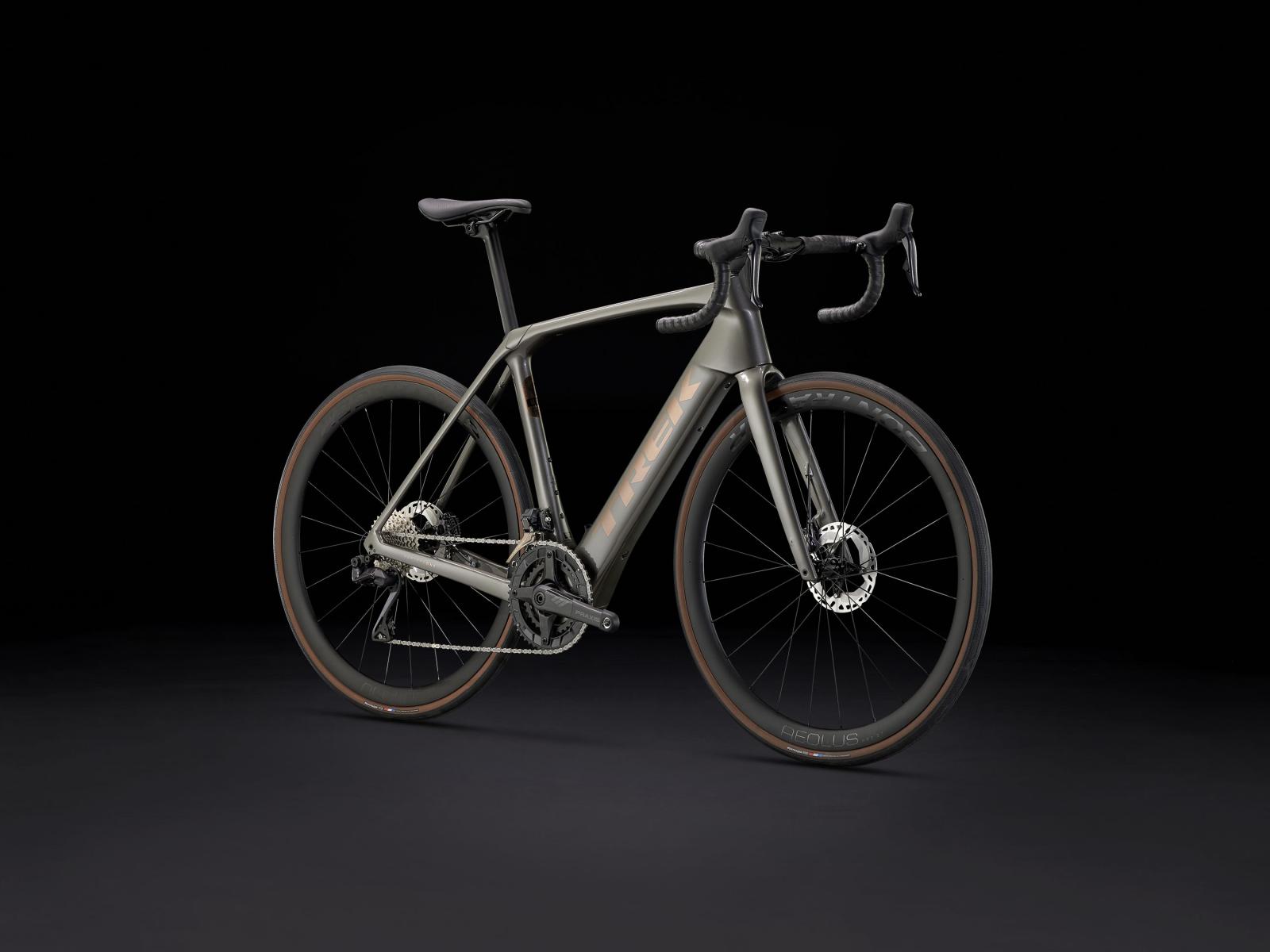 Einen äußerst leichten Rahmen aus 800 Series OCLV Carbon mit hinterem IsoSpeed. Einen kraftvollen Harmonic Pinring-Motor von TQ mit einem Drehmoment von 50 Nm, der dich bis zu einer Geschwindigkeit von 25 km/h unterstützt, einen 360 Wh großen integrierten Akku, ein in den Rahmen integriertes, smartes LED-Display und diskret in die Bremsgriffgummis verbaute Bedienelemente für das Umschalten der Unterstützungsmodi. Aeolus Pro 37-Laufräder aus OCLV Carbon, eine drahtlose, elektronische Shimano Ultegra Di2 2x12-Schaltung, eine Carbonkurbelgarnitur, ein vibrationsdämpfender Bontrager Pro IsoCore-Lenker und ein RCS Pro-Vorbau mit voll