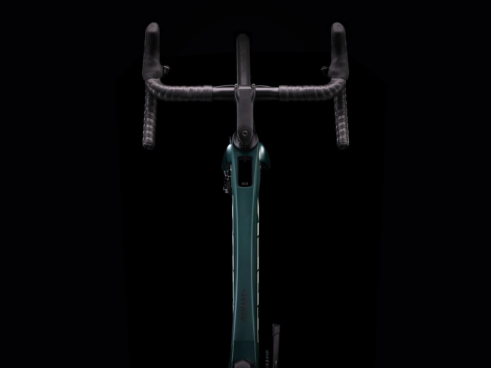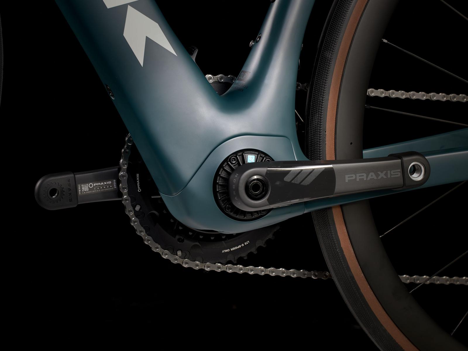 Einen äußerst leichten Rahmen aus 800 Series OCLV Carbon mit hinterem IsoSpeed. Einen kraftvollen Harmonic Pinring-Motor von TQ mit einem Drehmoment von 50 Nm, der dich bis zu einer Geschwindigkeit von 25 km/h unterstützt, einen 360 Wh großen integrierten Akku, ein in den Rahmen integriertes, smartes LED-Display und diskret in die Bremsgriffgummis verbaute Bedienelemente für das Umschalten der Unterstützungsmodi. Aeolus Pro 37-Laufräder aus OCLV Carbon, eine drahtlose, elektronische Shimano Ultegra Di2 2x12-Schaltung, eine Carbonkurbelgarnitur, ein vibrationsdämpfender Bontrager Pro IsoCore-Lenker und ein RCS Pro-Vorbau mit voll