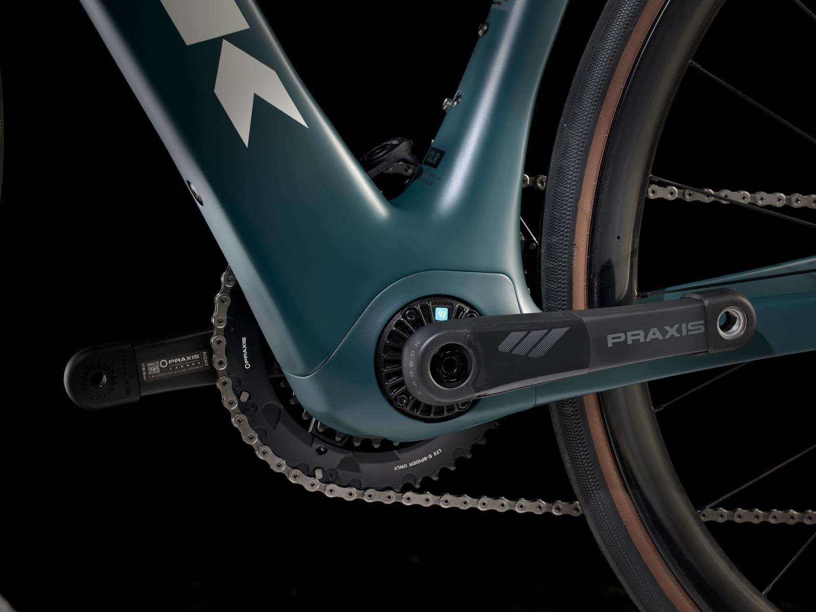 Unseren besten und leichtesten Rahmen aus 800 Series OCLV Carbon mit hinterem IsoSpeed. Einen kraftvollen Harmonic Pin-Ring Motor von TQ mit einem Drehmoment von 50 Nm, der dich bis zu einer Geschwindigkeit von 25 km/h unterstützt, einen 360 Wh großen integrierten Akku, ein in den Rahmen integriertes, smartes LED-Display und diskret in die Bremsgriffgummis verbaute Bedienelemente für das Umschalten der Unterstützungsmodi. Aeolus RSL 37 Laufräder aus OCLV Carbon, einen drahtlosen, elektronischen Shimano Dura-Ace Di2 2x12-Antrieb, Carbonkurbeln, einen vibrationsdämpfenden Bontrager Pro IsoCore Lenker und einen RCS Pro Vorbau mit v
