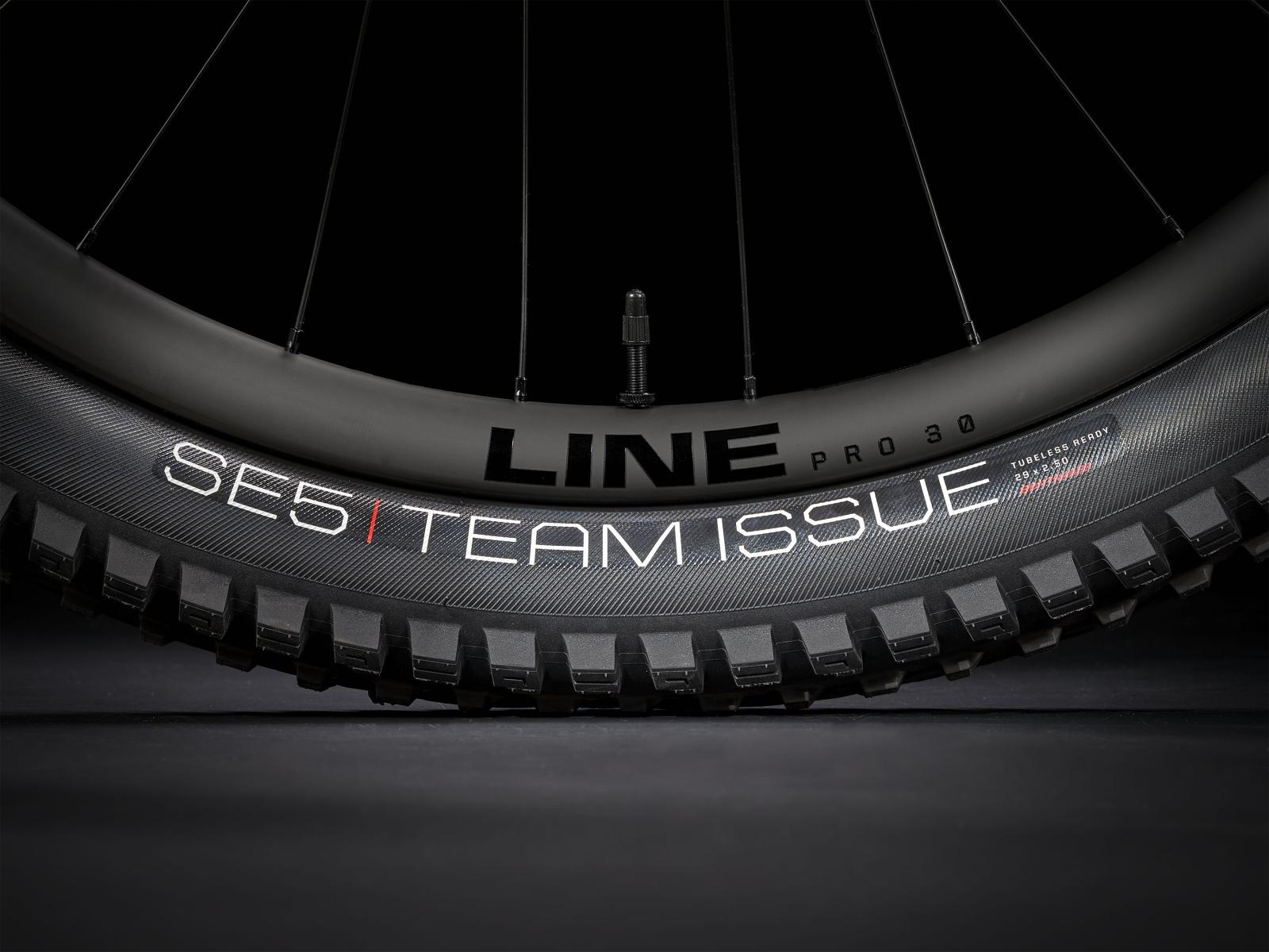 Reifen: Bontrager SE5 Team Issue, Tubeless Ready, Core Strength-Flankenschutz, Aramidwulstkern, 120 TPI, 29 x 2.50