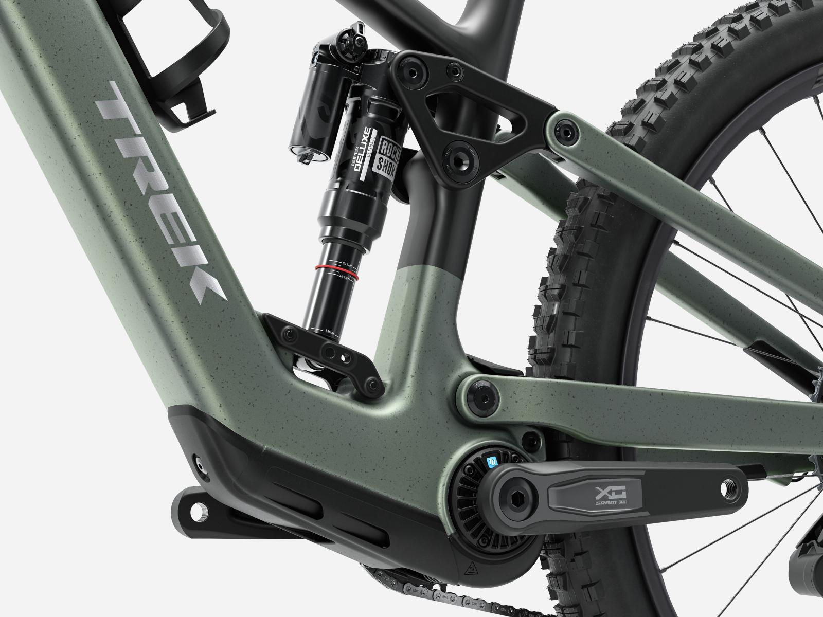 Rahmen: OCLV Mountain Carbon, herausnehmbarer Akku, verstellbarer Steuersatzwinkel, verstellbares Hebelverhältnis, geführte interne Zug- und Leitungsverlegung, austauschbare Aluminiumumlenkhebel, austauschbare untere Dämpferaufnahme, Unterrohrschutz, Shuttle-Protektor, ABP, UDH, Boost148, anpassbarer