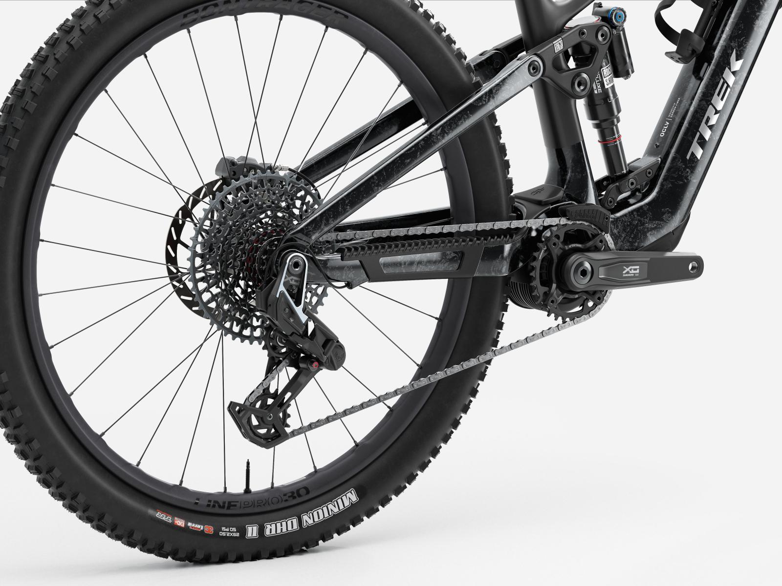 Rahmen: OCLV Mountain Carbon, herausnehmbarer Akku, verstellbarer Steuersatzwinkel, verstellbares Hebelverhältnis, geführte interne Zug- und Leitungsverlegung, austauschbare Aluminiumumlenkhebel, austauschbare untere Dämpferaufnahme, Unterrohrschutz, Shuttle-Protektor, ABP, UDH, Boost148, anpassbarer