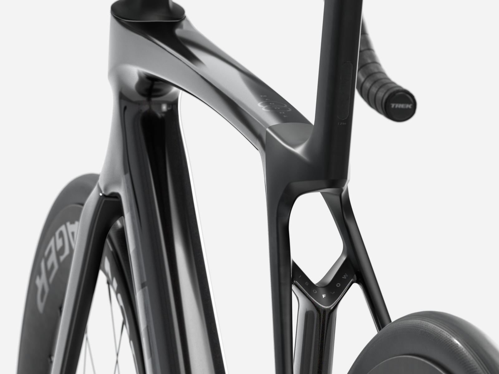 Gabel: Madone Gen 8, Vollcarbon, konischer Carbongabelschaft, interne Bremsleitungsführung, Flat Mount Scheibenbremsaufnahme, abgeschrägte 12 x 100 mm Steckachse