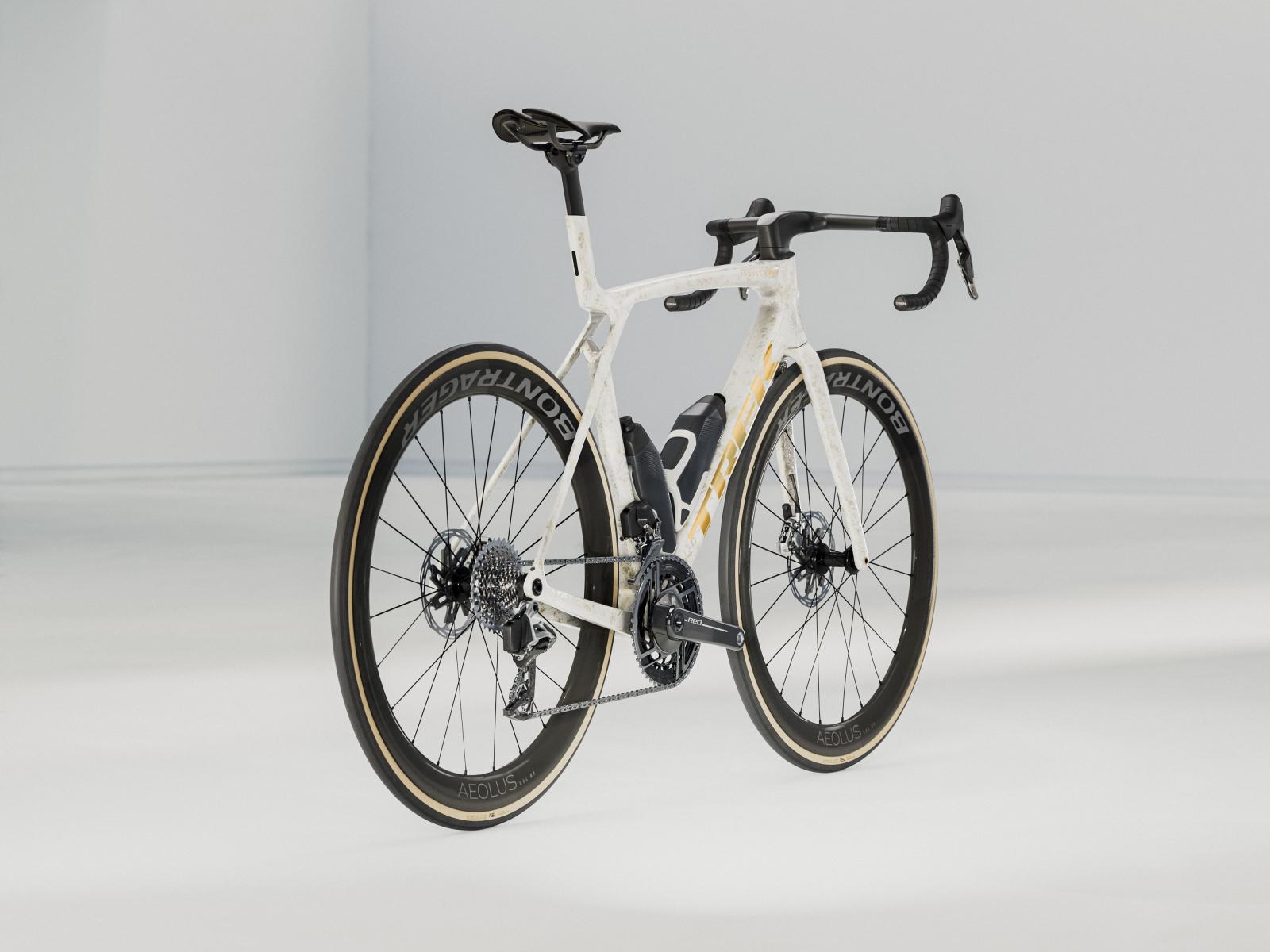 Einen unglaublich leichten, aerodynamisch optimierten Rahmen aus unserem besten 900 Series OCLV Carbon samt IsoFlow-Komforttechnologie und Watt-sparenden RSL Aero Trinkflaschen und Flaschenhaltern. Dazu gibts SRAMs neuesten ultraleichten RED AXS E1 Antrieb samt Powermeter für datengestützte Trainingsrunden, während das verbaute, weit verbreitete Universalschaltauge (UDH) die Ersatzteilbeschaffung erleichtert. Abgerundet wird die Ausstattung von schlauchlosen Bontrager Aeolus RSL 51 Carbonlaufrädern und einer einteiligen Trek Aero RSL Lenker/Vorbau-Einheit.