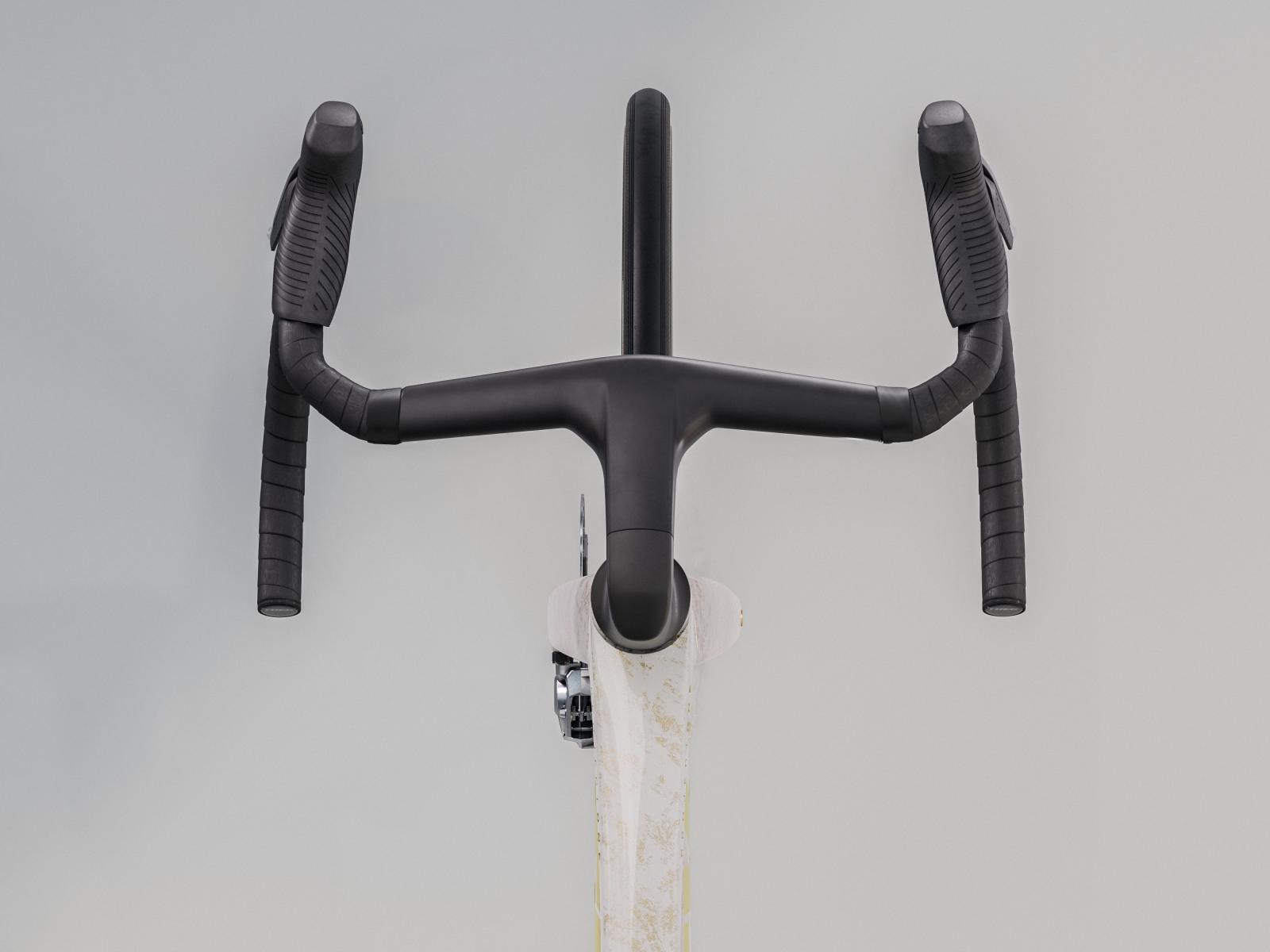 Die neue einteilige Lenker/Vorbau-Einheit ist leichter, aerodynamischer und ergonomischer als die Vorgängerversion. Darüber hinaus ermöglicht der im Vergleich zum Unterlenker 3 cm schmalere Oberlenker die Anpassung der Positionierung auf dem Bike, um entweder in der Oberlenkerposition von einer besseren Aerodynamik zu profitieren oder im Unterlenker mehr Kraft aufs Pedal zu bringen.