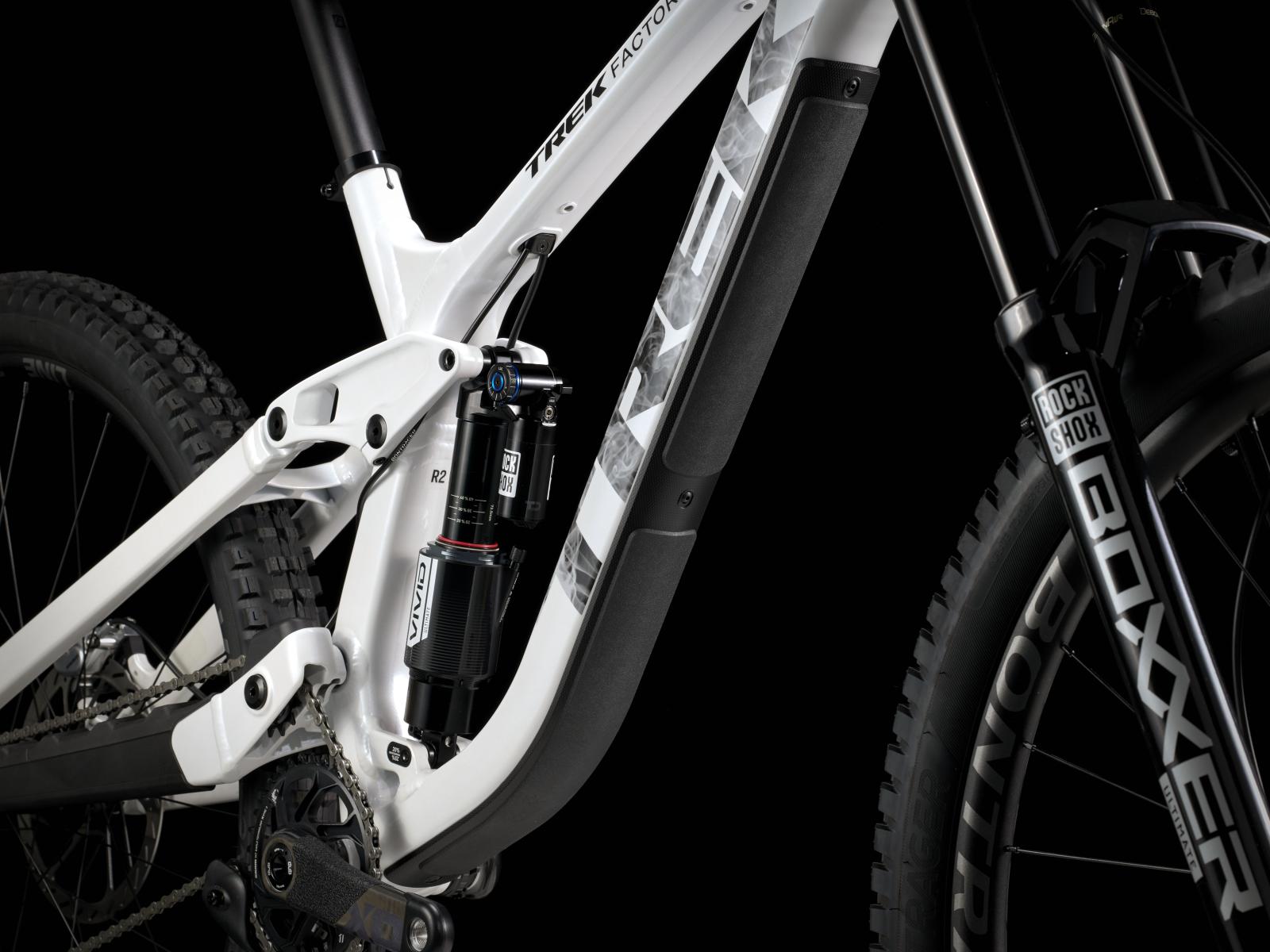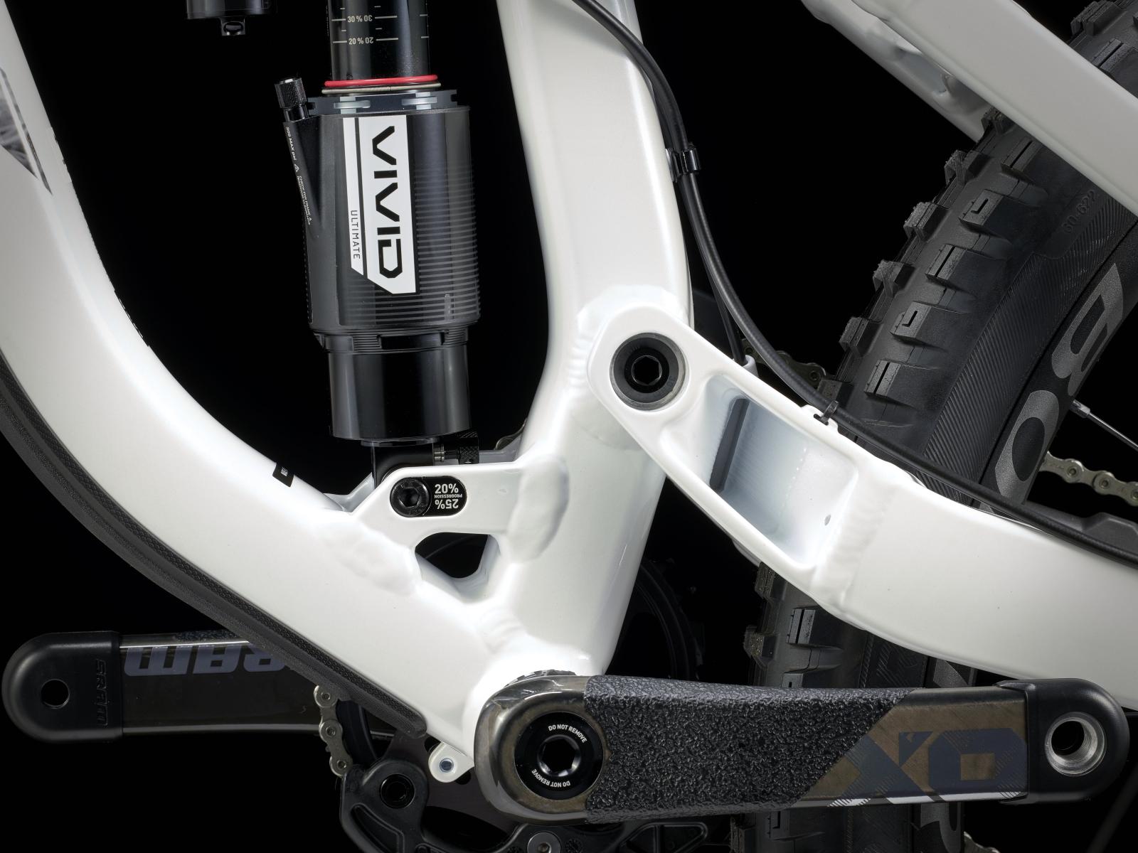 - Einfache Verstellung der Progression an der unteren Dämpferaufnahme: 20 % für geschmeidige Runs im Park, 25 % für hohe Renneffizienz.