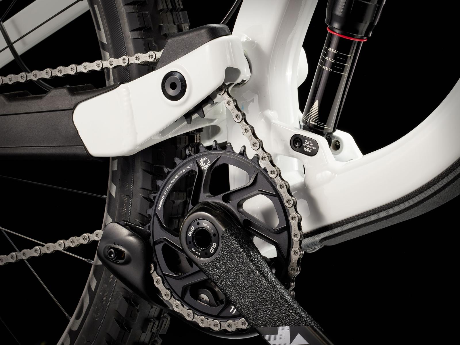- Das neue Fahrwerkslayout mit hohem Dreh- und Umlenkpunkt verbessert die Traktion, unterstützt höhere Geschwindigkeiten und reduziert den Pedalrückschlag für mehr Stabilität.
