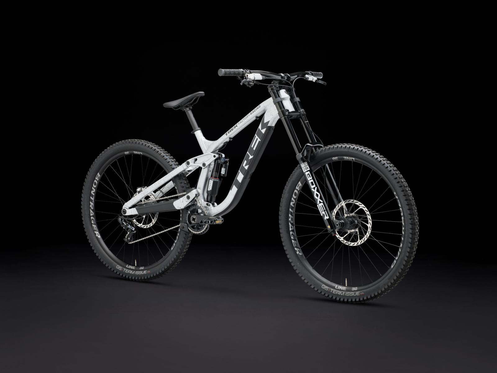 Einen robusten Aluminiumrahmen, einen RockShox Vivid Ultimate Dämpfer mit 200 mm Federweg, eine RockShox BoXXer Ultimate Gabel mit 200 mm Federweg, DebonAir+ Federung und Charger 3 Dämpfung, SRAM Maven Ultimate 4-Kolben-Scheibenbremsen, einen SRAM X01 DH 7fach-Antrieb und einen Carbonlenker.