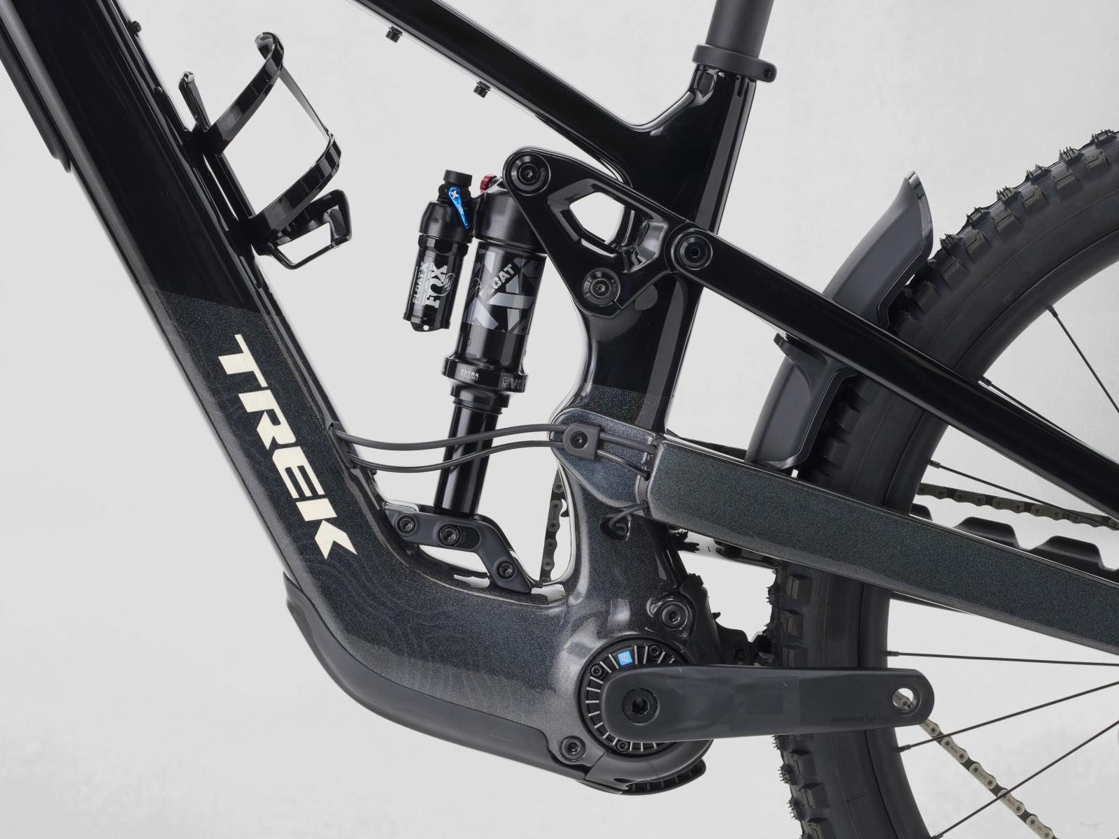 Rahmen: OCLV Mountain Carbon, herausnehmbarer Akku, hoher Hauptdrehpunkt, Umlenkrolle, Steuersatz mit verstellbarem Lenkwinkel, verstellbare Progression, integrierter Rahmenschutz, interne Zugführung, Alu-Umlenkhebel, Aufnahme für obere Kettenführung, 55 mm Kettenlinie, ABP, UDH, 148 x 12 mm Steckach