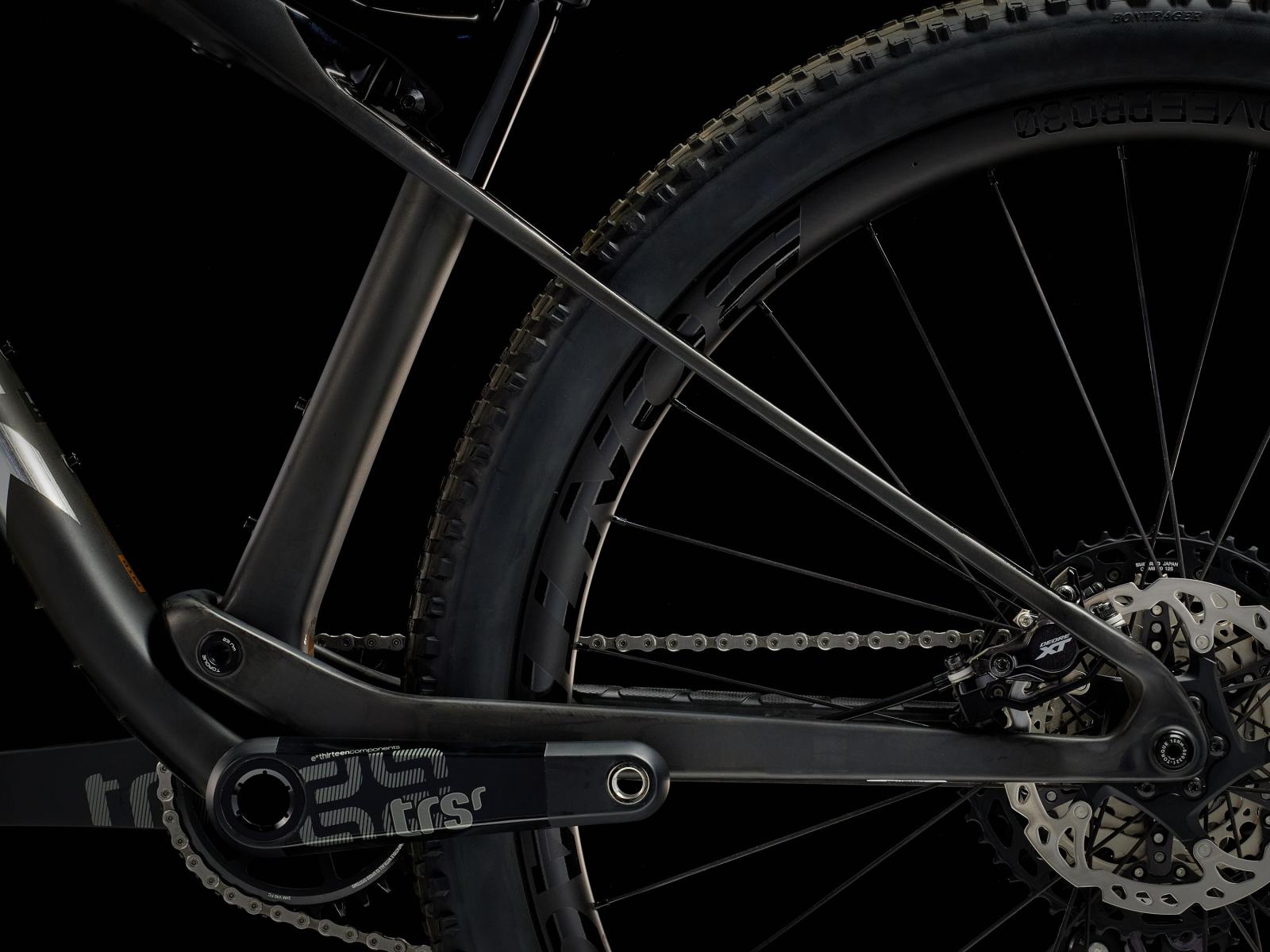 Einen ultraleichten, komplett aus OCLV Mountain Carbon gefertigten Rahmen mit 60 mm Federweg, eine FOX Performance 32 Step-Cast-Gabel mit 100 mm Federweg und Treks exklusiven, speziell für das Supercaliber entwickelten IsoStrut FOX Performance-Dämpfer. Dazu gibts einen Remote-Lockout, die leichtgängigen, präzisen Gangwechsel eines Shimano XT-Antriebs, eine integrierte Bontrager RSL Lenker/Vorbau-Einheit und Bontrager Kovee Pro 30-Carbonlaufräder samt Rapid Drive-Hinterradnabe mit 108 Zähnen für einen verzögerungsfreien Kraftschluss.