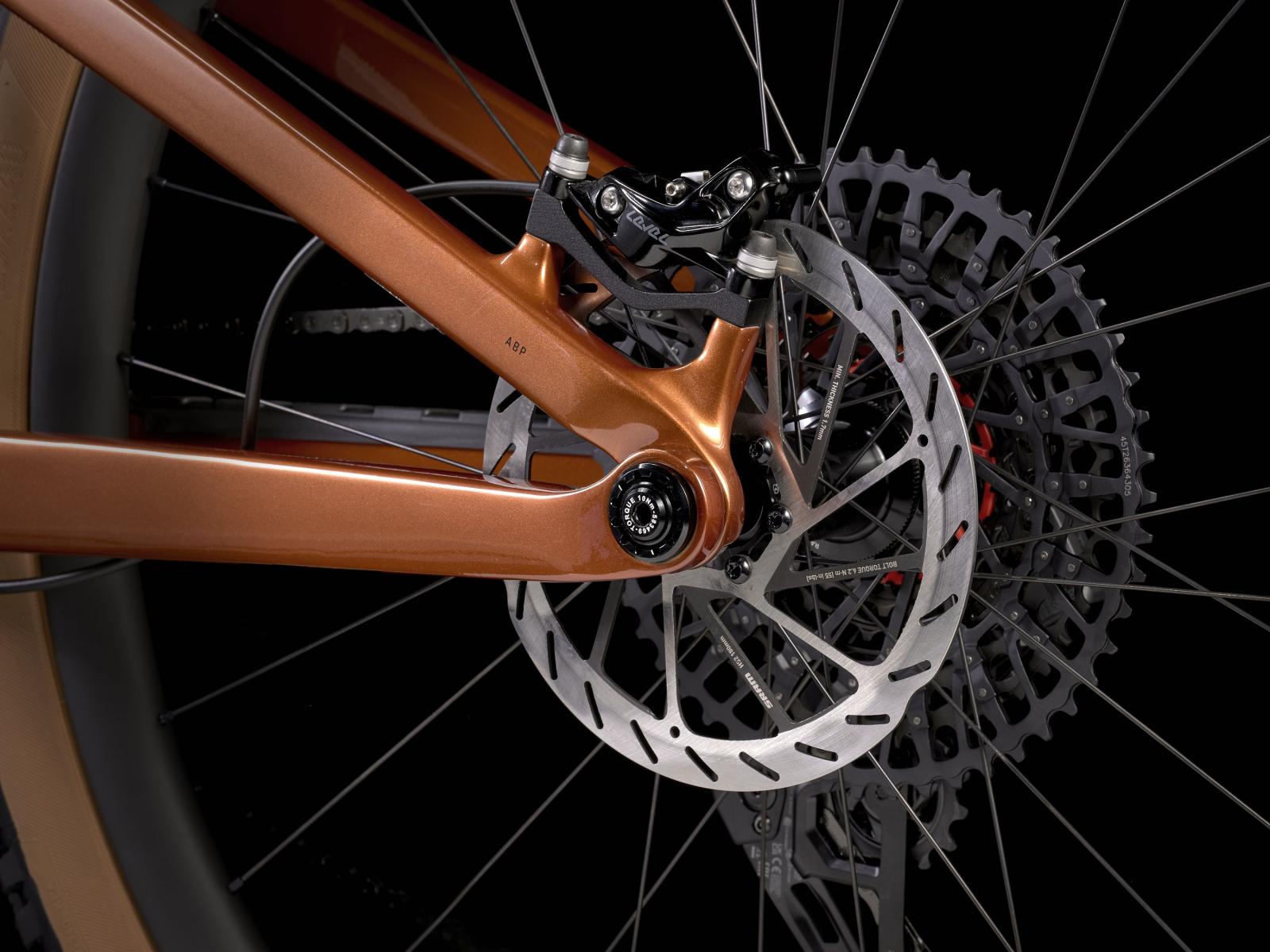 Einen leichten und steifen Rahmen aus OCLV Mountain Carbon, eine RockShox Pike Ultimate-Gabel mit 130 mm Federweg, DebonAir-Feder und Charger 3 RC2-Dämpfung, einen RockShox Deluxe Ultimate RCT-Dämpfer mit 120 mm Federweg und einen direkt montierten, sowohl präzisen als auch robusten SRAM X0 AXS 12fach-Antrieb. Außerdem kommt es mit breiten Bontrager Line Elite 30-Carbonlaufrädern samt Rapid Drive-Nabe mit 108 Zähnen für einen verzögerungsfreien Kraftschluss, mit verlässlichen, kraftvoll zupackenden 4-Kolben-Scheibenbremsen für maximales Vertrauen auf allen Abfahrten, einer RockShox Reverb AXS-Variosattelstütze und einer Lenker/V