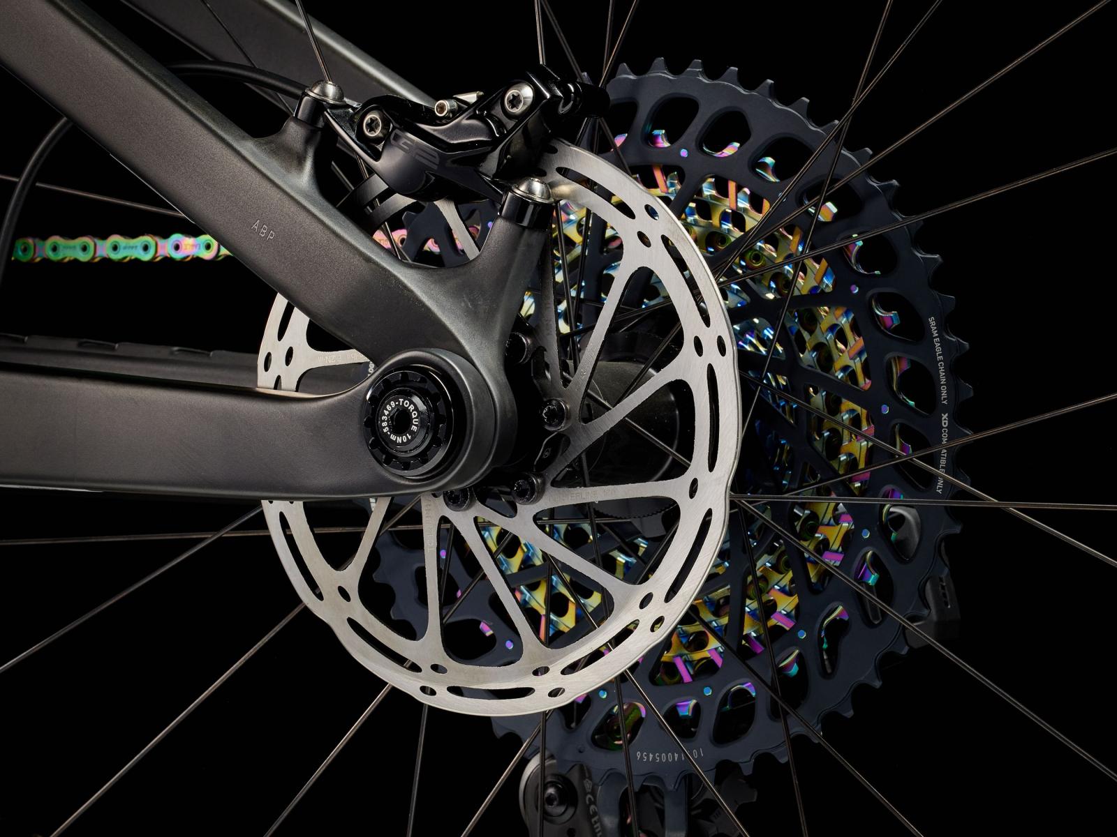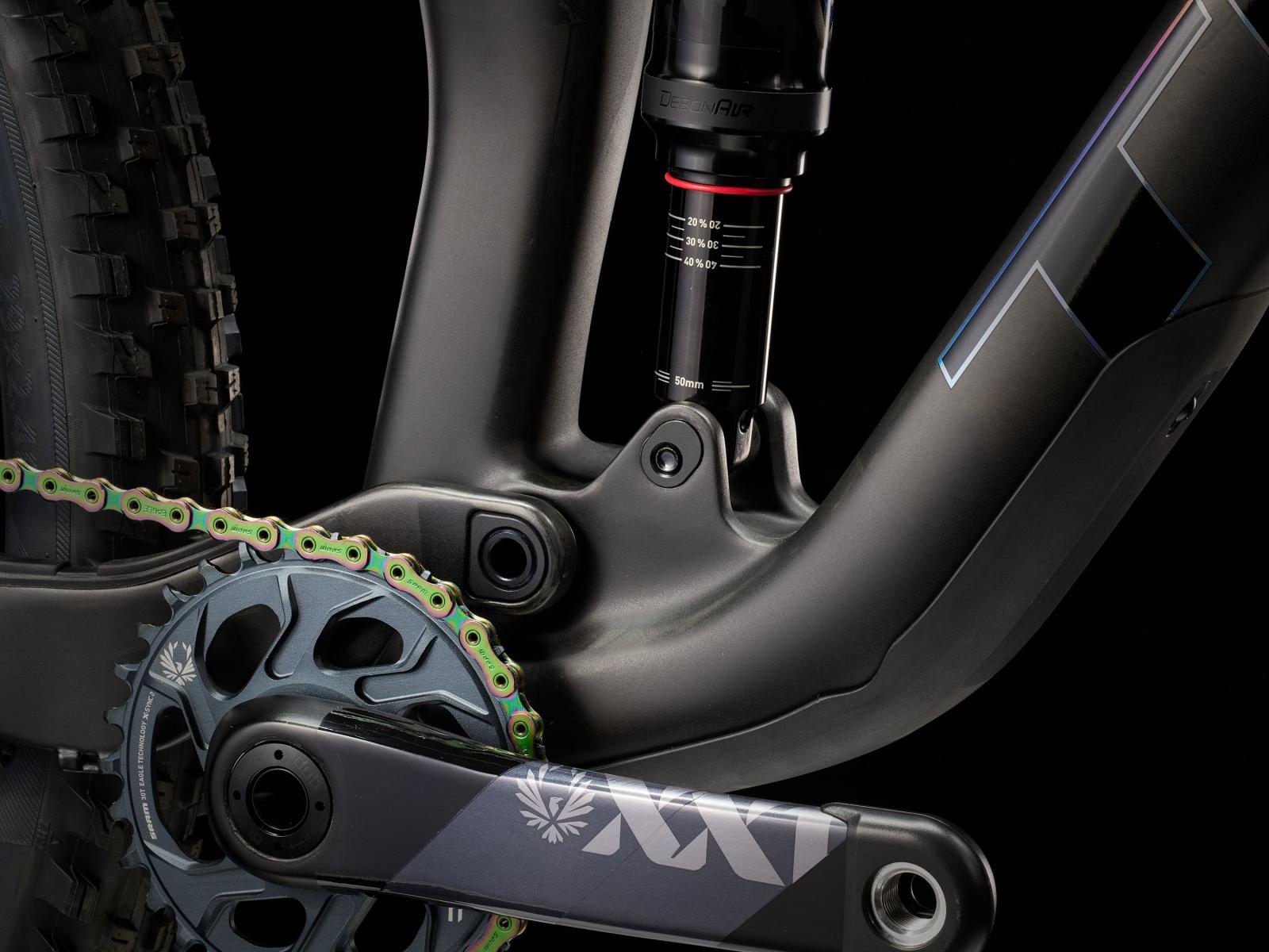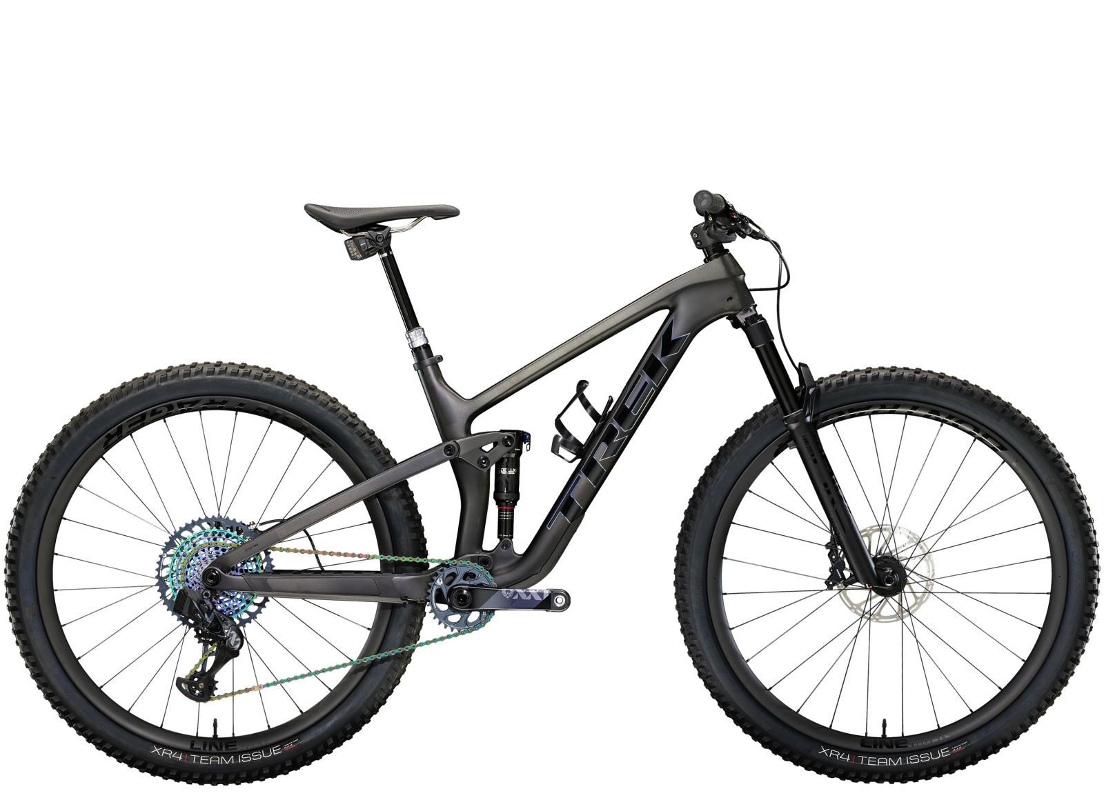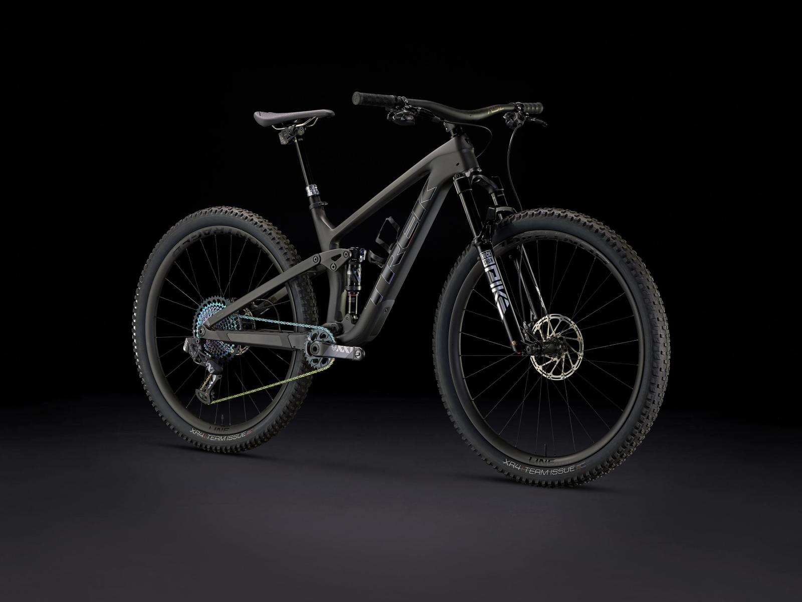 Einen Vollcarbonrahmen, eine extrem geschmeidig arbeitende 130 mm RockShox Pike Ultimate-Federgabel mit Charger 3 RC2-Dämpfer und breiterem Einstellbereich. Dazu bekommst du einen RockShox Deluxe Ultimate-Dämpfer mit 120 mm Federweg und einen komplett drahtlosen SRAM XX1 Eagle AXS-Antrieb. Außerdem gibt es breite Bontrager Line Pro 30-Carbonlaufräder samt Rapid Drive-Nabe mit 108 Zähnen für einen verzögerungsfreien Kraftschluss, eine drahtlose RockShox Reverb AXS-Variosattelstütze und SRAM Level Ultimate-Scheibenbremsen mit Carbonbremshebeln.